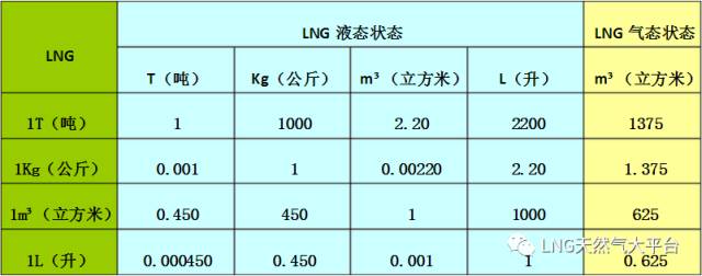 LNG密度(430Kg/m³)是标准状态下甲烷的625倍,即1m³LNG可气化成625m³天然气(1m³LNG=0.45吨LNG,即1吨LNG=2.2m³LNG),故1吨LNG可气化为1375m³天然气。